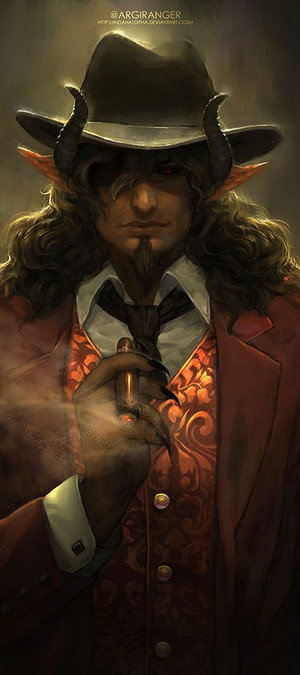 Il n’y a que deux choses qui restent constantes, peu importe son apparence : ses yeux rougeoyants, tout d’abord. S’ils brillent bien moins sous forme humaine que démoniaque, ils gardent une teinte qui n’a pas grand chose de naturel pour un terrien normal. L’autre constante… C’est son style : il met un point d’orgue à être élégant et à afficher son statut comme sa richesse. Vêtu d’habits taillés sur mesure, dans les tissus les plus confortables et les plus onéreux, il s’arrange toujours pour qu’on ne regarde que lui.