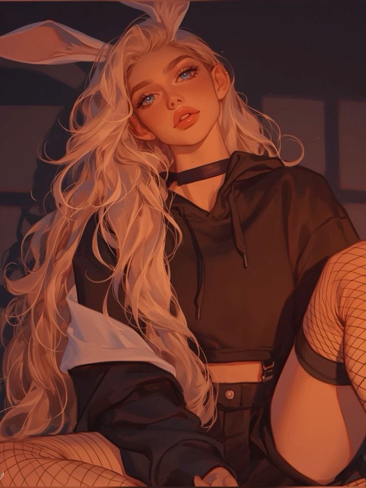 Ses cheveux, d’un blanc neige, tombent en mèches soyeuses qu’elle aime coiffer de façon élégante, tantôt lisses, tantôt légèrement ondulés. Sur sa tête, deux longues oreilles de lapin blanches, souples et expressives, rappellent son origine non humaine. Lorsqu’elle se déplace, elles oscillent légèrement, traduisant souvent ses émotions aussi clairement qu’un visage. À l’arrière, une petite queue de lapin blanche complète le tableau, discrète mais impossible à ignorer pour ceux qui la connaissent vraiment.