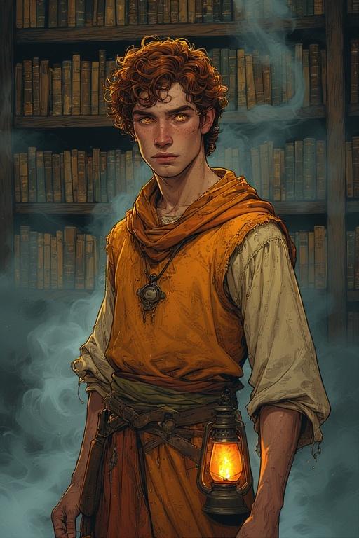 Description physiqueVous voyez un jeune homme, qui a atteint la vingtaine. Sa taille semble être aux alentours d’1m80, et en dépit de l’armure de cuir qu’il porte sur ses habits de voyage couleur de flamme et du sabre qui pend à sa ceinture, il n’a pas spécialement l’air d’être physiquement prêt pour échanger des passes d’armes. Des traces de brûlures sont présentes sur ses doigts, et si vous le voyez sans ses vêtements, vous verrez qu’il en a également un peu partout sur le corps, ainsi que de fines cicatrices, tous témoins de ses actions passées et démontrant qu’il a l’air, en fait, d’être capable d’échanger des passes d’armes, voire davantage.